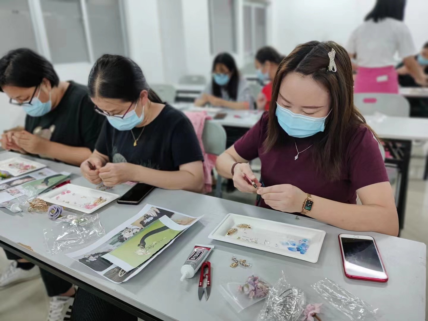 活動(dòng)現(xiàn)場(chǎng),漢邦咨詢農(nóng)老師詳細(xì)地講解了發(fā)夾制作方法,傳授制作技巧,在老師的巧手下,一些看似普通的絲帶、夾子、珠花,隨即變成了一個(gè)個(gè)精美的發(fā)夾,學(xué)員們紛紛驚嘆,不由自主地動(dòng)起手來(lái),學(xué)著老師開(kāi)始認(rèn)真制作,經(jīng)過(guò)不斷地努力,創(chuàng)意十足的手工發(fā)夾便誕生了,每個(gè)人都迫不及待地將自己制作的發(fā)夾戴上,滿滿的自豪感和幸福感躍然紙上,露出了滿意的笑容。
